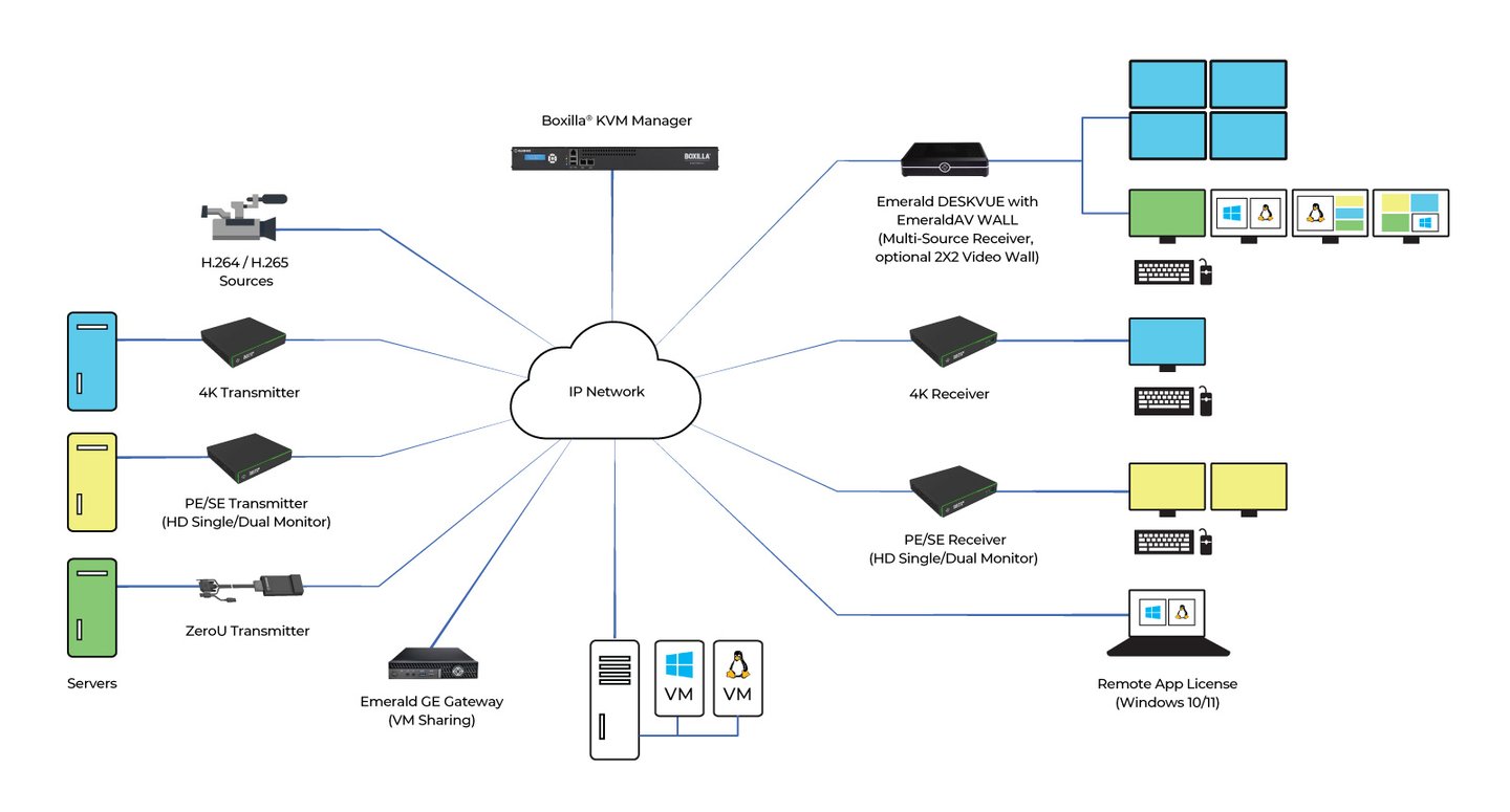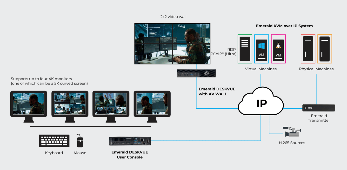 Connects to physical systems via Emerald transmitters; virtual machines using RDP, PCoIP, PCoIP ultra, H.264/265 sources; and VNC.