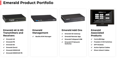 Integrates with Emerald Unified KVM and the Boxilla KVM manager for device configuration, monitoring, and authentication.